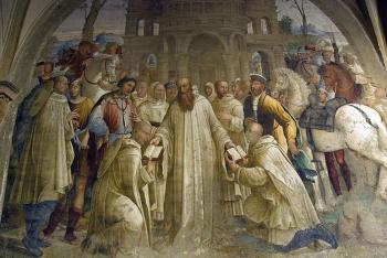 A sinistra: "Come Benedetto riceve li due giovanetti romani Mauro e Placido"