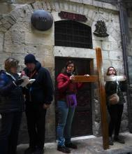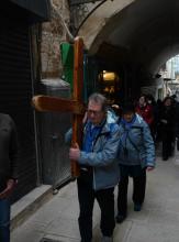 ![]() | Gerusalemme - la Via Crucis La pratica della Via Crucis nella città vecchia è molto diffusa fra i gruppi di pellegrini, con inizio presso una struttura francescana nella Via Dolorosa ed arrivo sopra la Basilica del Santo Sepolcro, attraverso il quartiere mussulmano con tutte le sue botteghe in attività. I Francescani celebrano la Via Crucis il venerdì con partenza dal cortile della scuola coranica situata dove al tempo di Gesù si trovava la Torre Antonia, (cioè il presidio romano presso il quale "lavorava" anche Ponzio Pilato quanto si trovata a Gerusalemme) e con le ultime cinque stazioni all'interno della Basilica del Santo Sepolcro. Le stazioni sono contrassegnate da targhe e piccoli bassorilievi sui muri (alcune anche da una cappelletta). | ![]() | |||