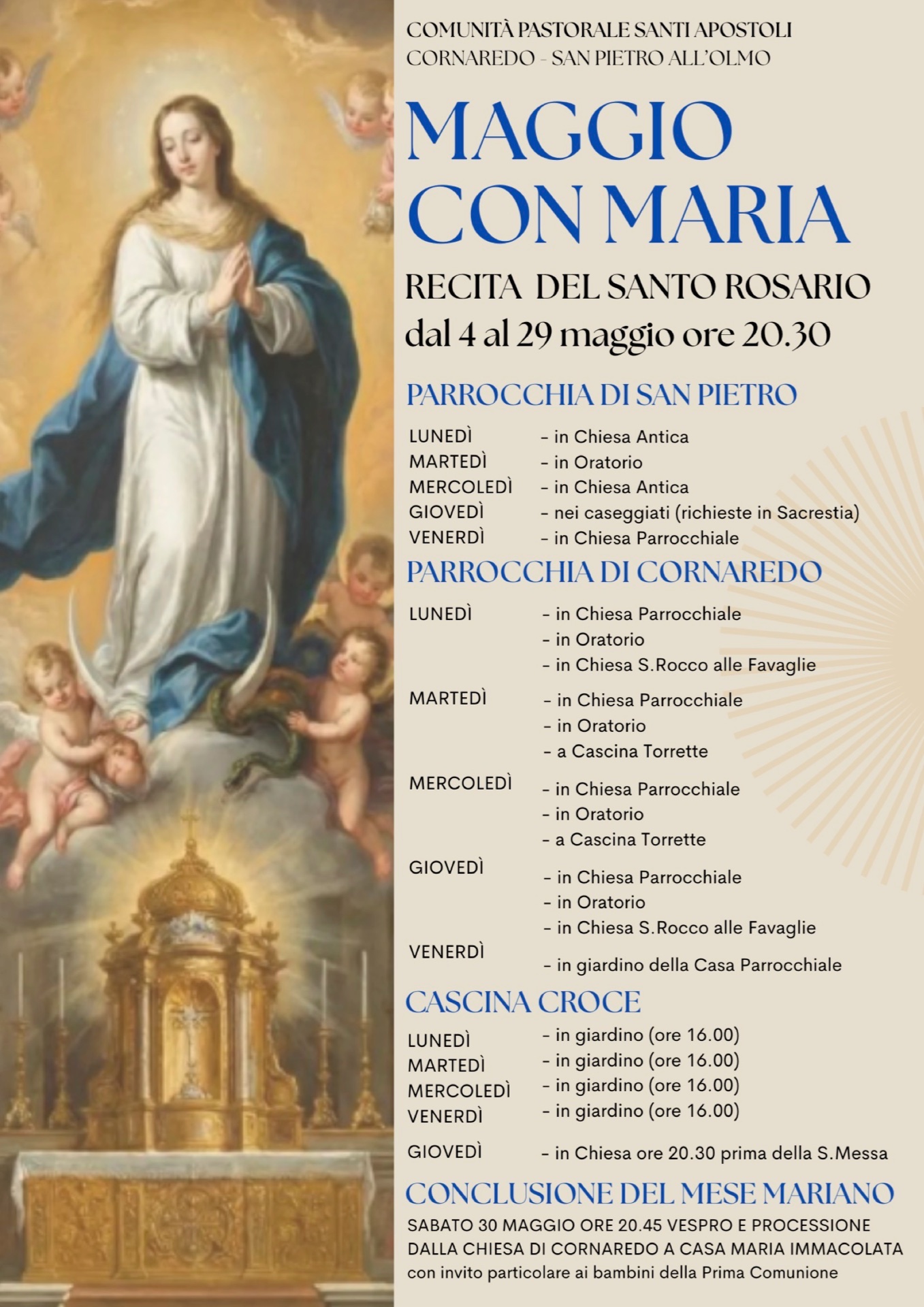 Il Mese di Maggio è dedicato alla Madonna e come da tradizione delle nostre parrocchie ogni sera alle 20.30 sarà recitato il S.Rosario nei luoghi indicati nel programma. A conclusione del mese si terrà la Processione.
