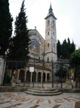 ![]() | Ain Karem - Visitazione della Vergine Maria Luca ci racconta «In quei giorni Maria si mise in viaggio verso la montagna e raggiunse in fretta una città di Giuda» (Lc 1, 39). Cioè Maria venne qui, dove si trovava la casa di Elisabetta, sua cugina, e del marito di lei, Gioacchino (siamo vicino a Gerusalemme, in Giudea). Elisabetta era incinta di Giovanni (che sarà il Battista) e Maria da poco aspettava Gesù. Già all'ingresso campeggia il richiamo al "Magnificat", la risposta di Maria al saluto di Elisabetta che, tradotta in una cinquantina di lingue, è esposta in altrettanti riquadri di ceramica sul muro alle spalle del gruppo bronzeo che all'ingresso del santuario ricorda l'incontro delle due donne. Il versetto di Luca citato sopra è - come al solito - molto "essenziale": sembra quasi che Maria abbia fatto un salto nella strada accanto per andare da Elisabetta. In realtà da Nazareth (in Galilea, a nord) dovette compiere un viaggio di circa centosessanta chilometri per raggiungere Ain Karem (pesso Gerusalemme, in Giudea, a sud) superando la Samaria. | ![]() | |||