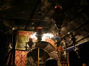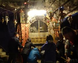 ![]() | Betlemme - la Grotta della Natività Uno dei Luoghi più santi della Cristianità è una piccola grotta sotto la grande Basilica della Natività; in realtà un breve e stretto corridoio annerito dalle tante lampade che pendono dal soffitto, secondo l'uro ortodosso (ai Greco-ortodossi è affidata la quasi totalità del complesso). Da secoli ogni giorno - esclusa la domenica e poche altre occasioni - i Francescani della Custodia di Terra Santa vengono qui in processione dal loro adiacente convento di Santa Caterina. I pelle­grini scendono qui dalla Basilica tramite ripide scale per una visita sempre ridotta a pochi istanti, per via dell'enorme afflusso di gente in così poco spazio. | ![]() | |||
