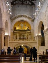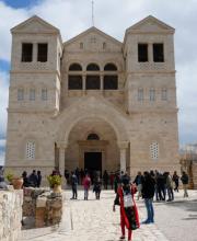 ![]() | Monte Tabor - la Trasfigurazione di Gesù «Gesù prese con sé Pietro, Gicomo e Giovanni suo fratello e li condusse in disparte, su un alto monte. E fu trasfigurato davanti a loro». Il Vangelo non ci dice esplicitamente quale fosse il monte, ma da molto tempo si ritiene trattarsi del Monte Tabor, rilievo piuttosto isolato non lontatno da Nazareth, in Galilea, dove sin dall'epoca crociata sono stati insediaenti cristiani alternati alle distruzioni degli invasori di turno. La Basilica della Trasfigurazione che vediamo oggi - della metà del '900 - ricorda nella facciata le tre tende proposte da Pietro per Gesù, Elia e Mosè (alla base delle cuspidi laterali vi sono due minuscole cappelle dedicate a Elia e a Mosè). Un servizio di minibus consente ai pellegrini di salire lungo la bellissima ma stretta e tortuosa strada .... salvo salire a piedi, come fece Gesù con i Suoi. | ![]() | |||